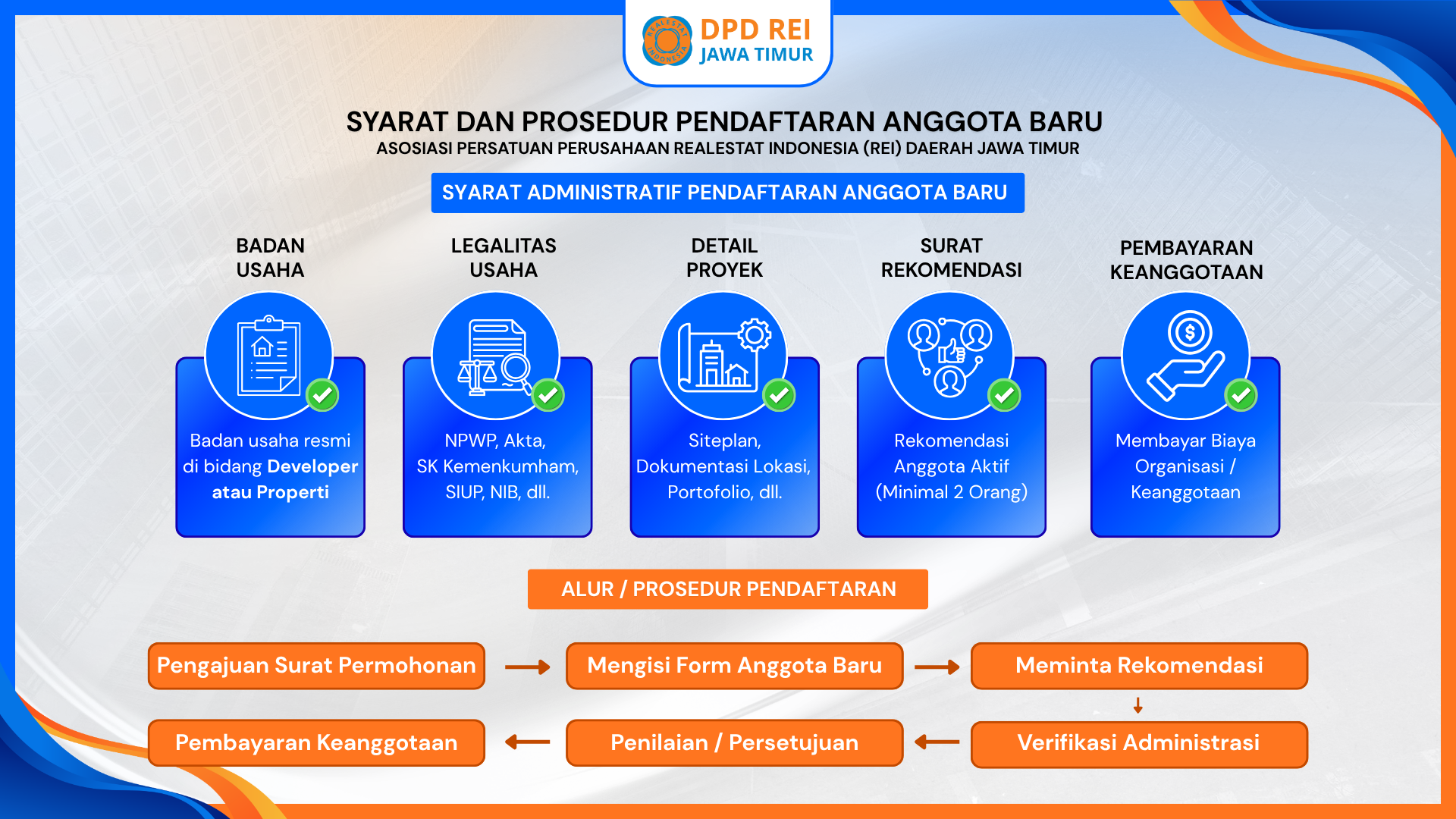 - Mengajukan surat permohonan yang ditujukan kepada Ketua Umum DPP REI melalui DPD REI. Mengisi biodata perusahaan dan melaporkan perkembangan data proyek yang telah dikerjakan dan atau rencana proyek yang akan dikembangkan.